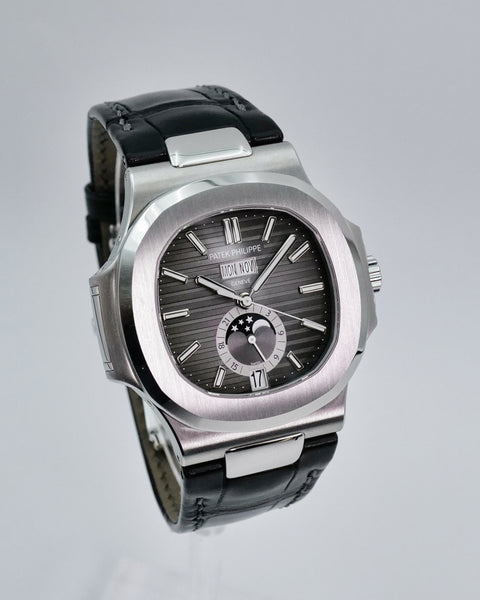 Crafted in stainless steel, the 40.5 mm case features the signature Nautilus porthole design paired with a striking black gradient dial that transitions from charcoal at the center to deep black along the edges. The watch showcases Patek’s renowned Annual Calendar and Moon Phase functions, delivering both utility and elegance in a clean, balanced layout.
